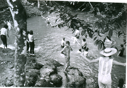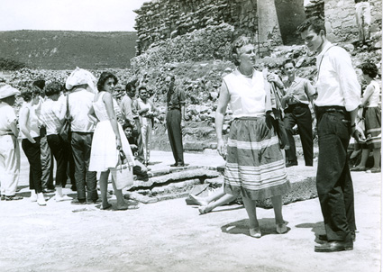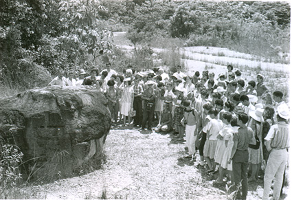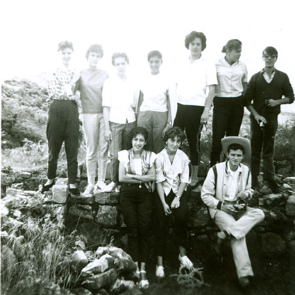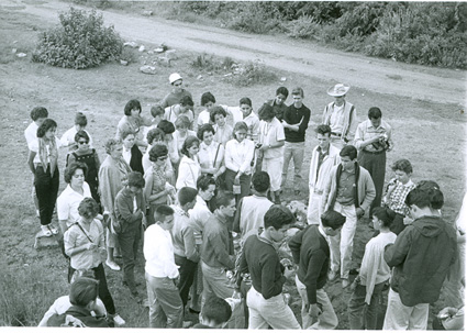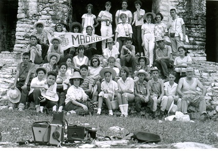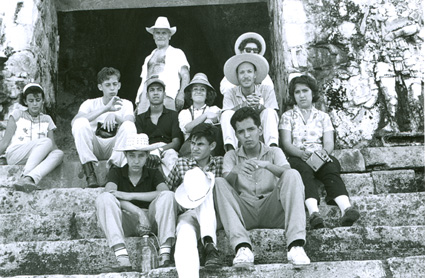 1960Grupo de alumnos observando un agujero en unas ruinas prehispánicas.