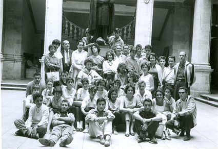 1962Foto de grupo de alumnos sentados en la escalinata de una construcción de piedra.