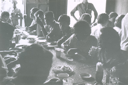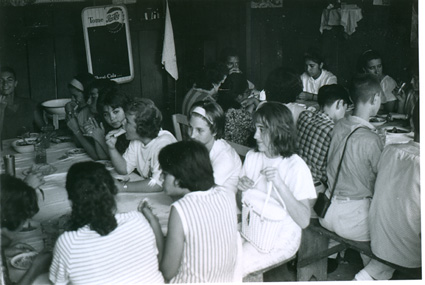 1961Vista de un grupo de chicos sentados en una mesa comiendo.
