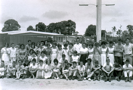 1960Grupo de alumnos fotografiados afuera de una construcción.