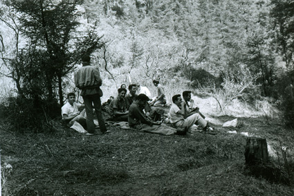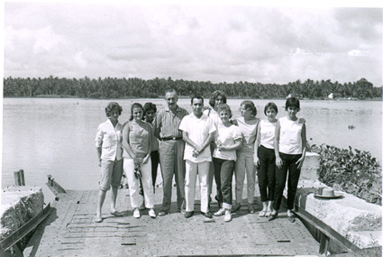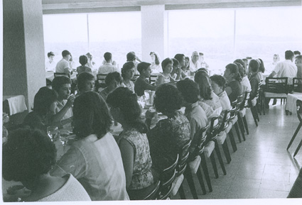 1962Vista de alumnos sentados en una mesa de comedor, de fondo se observa un lago.