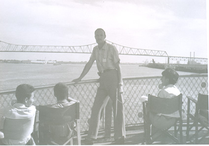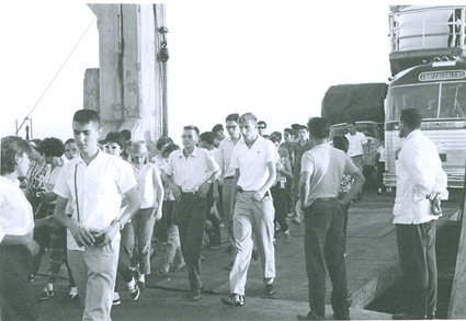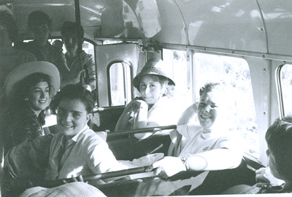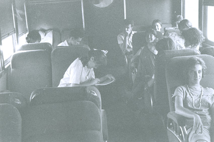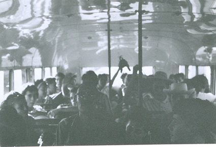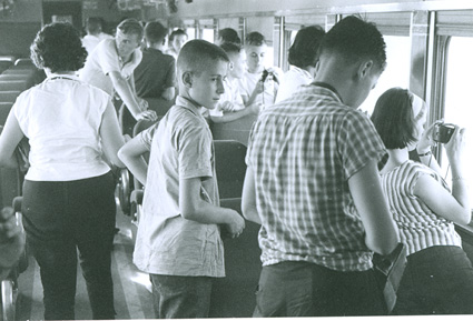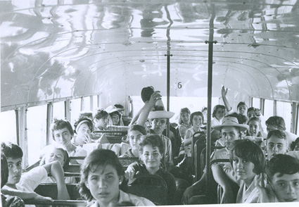 1961Grupo de chicos parados en un autobus, viendo por la ventana y tomando fotografías.