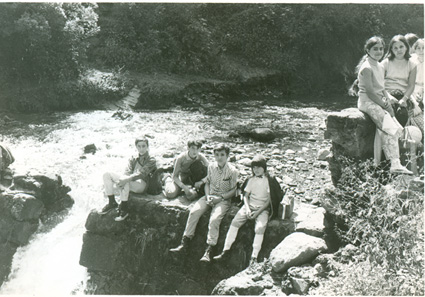 NO IDENTIFICADOChicos sentados en una barda de piedra en un rio, se ve el cauce del mismo.
