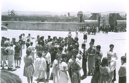 1961Grupo de chicos sentados en una barda viendo como juegan unos niños.