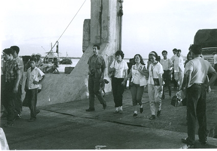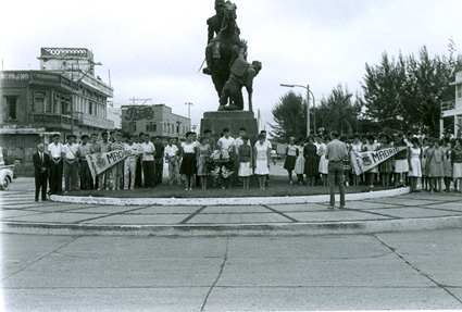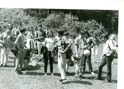 1960Grupo de alumnos reunidos posiblemente escuchando o recibiendo alguna instrucción.