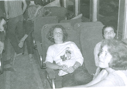 1961Grupo de chicos sentados, posiblemente en un vagón de un tren.