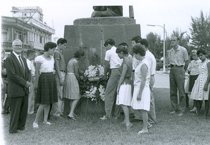 1961Grupo de chicos poniendo una ofrenda florar a lo pies de un monumento. Acompañados del maestro Eduardo Gorraéz.