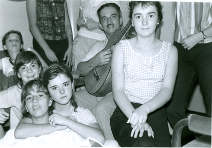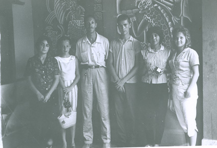 1962Dos chicos sentados, uno parado y una chica más fotografiados en una habitación.