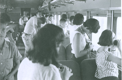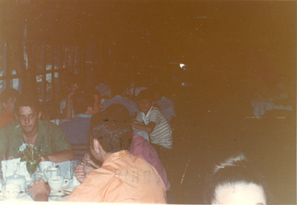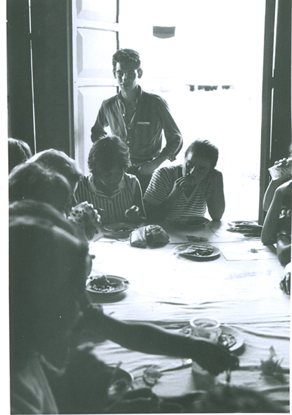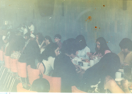 1961Grupo de alumnos sentados en una mesa comiendo.