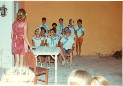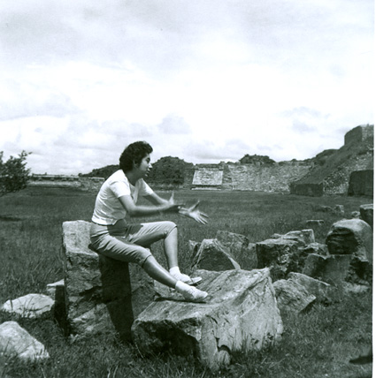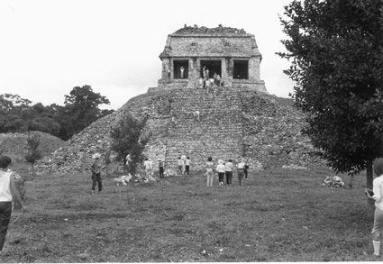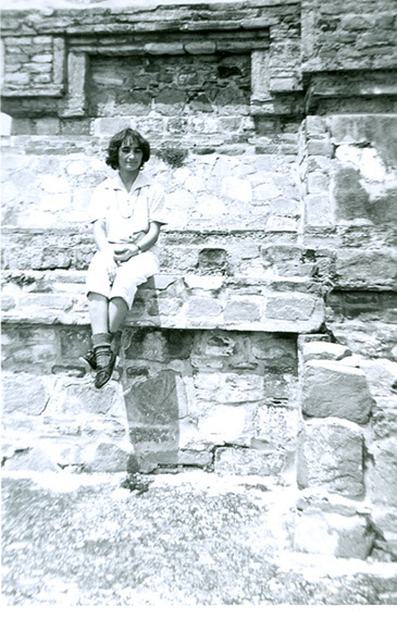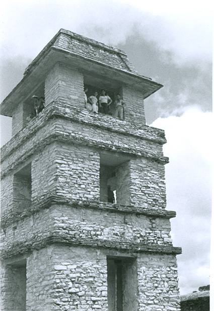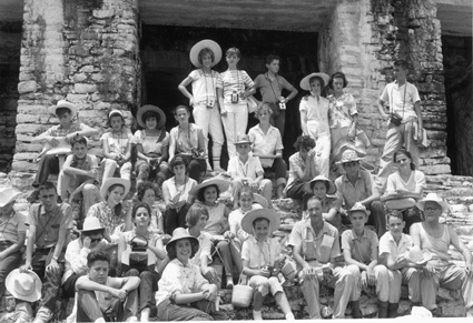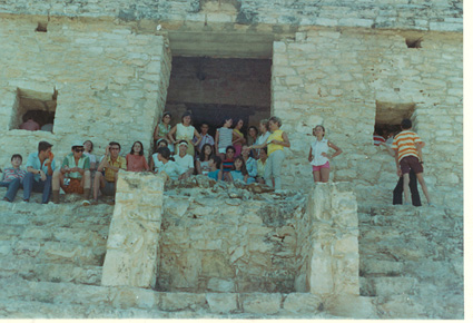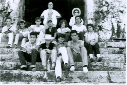 1971Grupo de alumnos sentados en las escaleras de una construcción prehispánica.