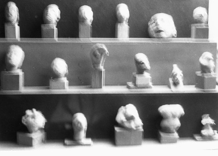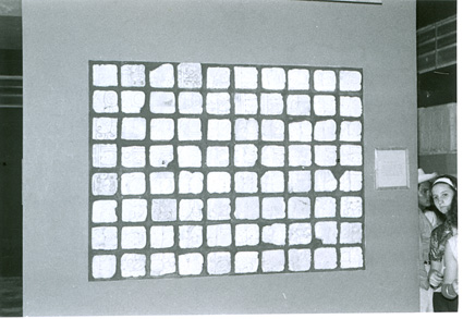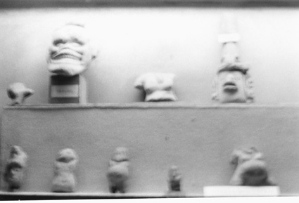 1971Vista de una mampara con figuras prehispánicas pegadas.