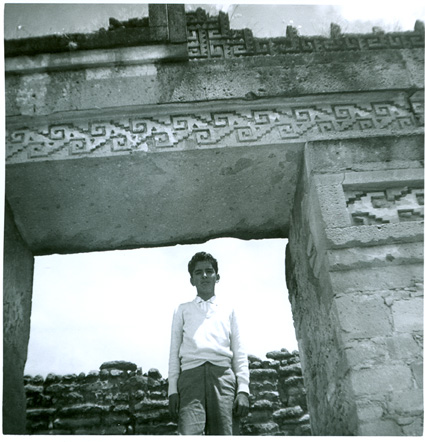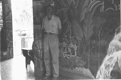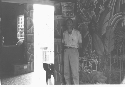 1961El maestro Eduardo Gorraéz delante de un mural con representación prehispánica.