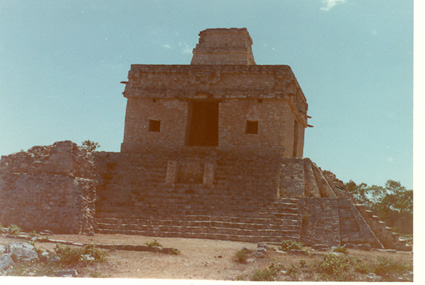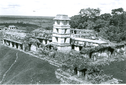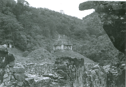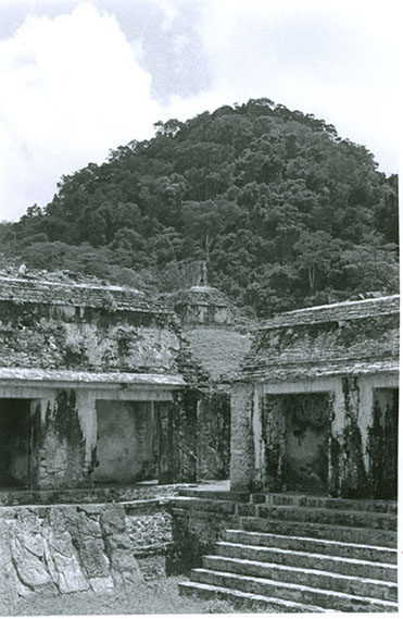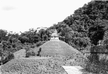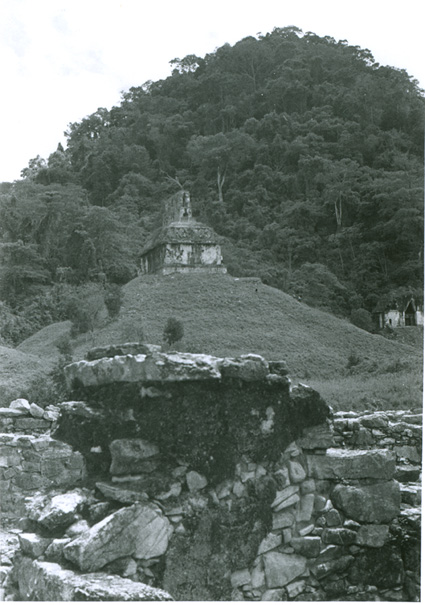 1961Vista de una pirámide prehispánica, encima de una montaña.