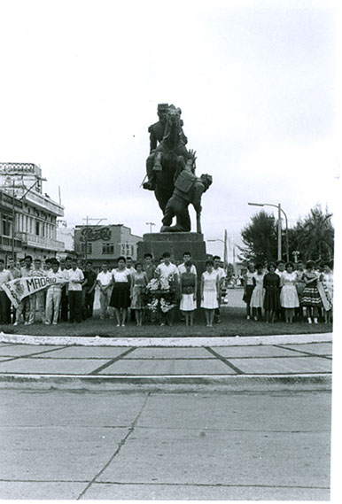 1961Grupo de alumnos montando guardia a un monumento con un caballo y un jinete. Hay un adorno floral y llevan un banderín del Colegio.