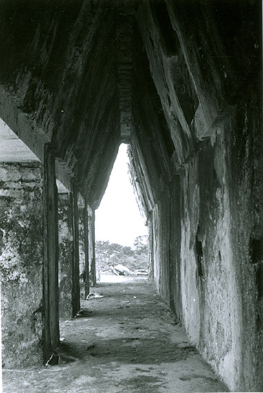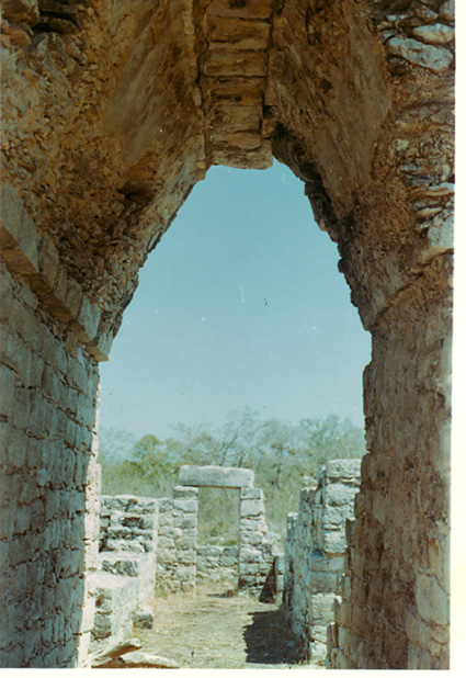1971Vista de un arco de piedra, al fondo se ven otras ruinas.