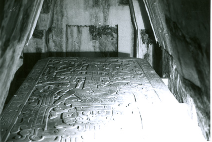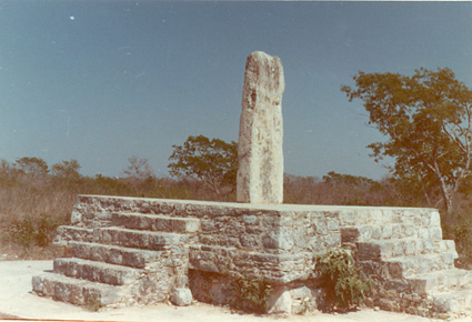 1971Vista de un monolito de piedra sobre un recuadro de piedra.