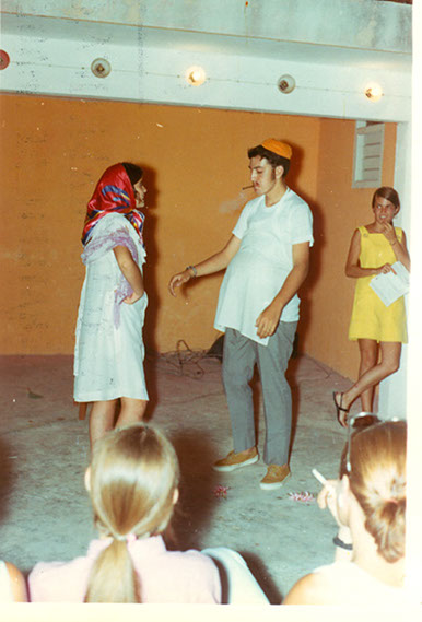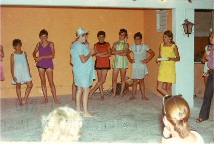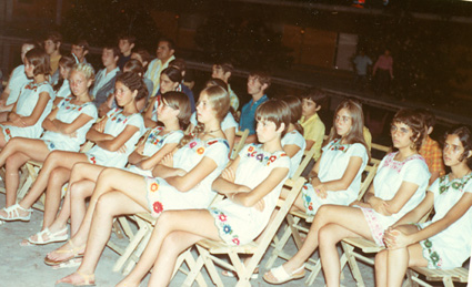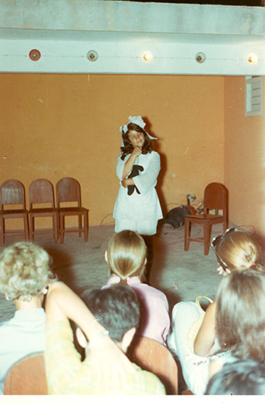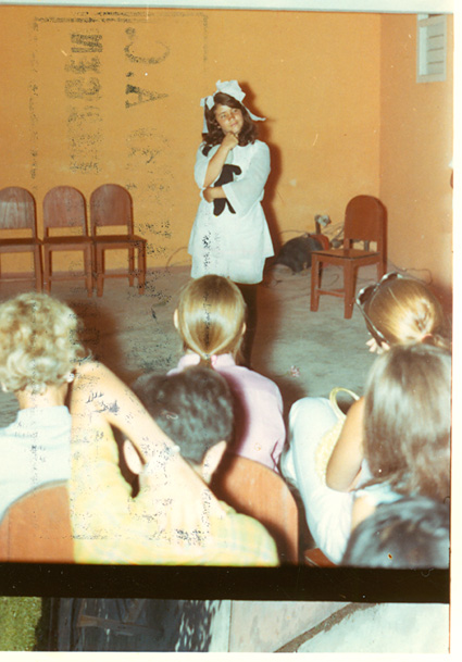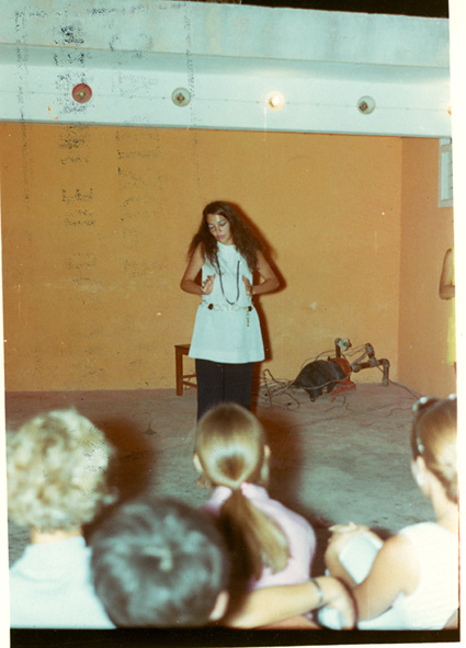 1971Una chica al frente al parecer explicando algo, se ve el público.