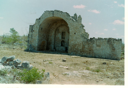 1971Vista de una construcción de piedra en ruinas, aparentemente fue una iglesia.