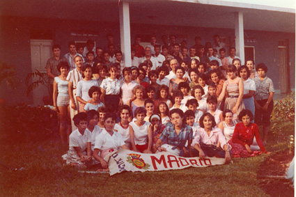 1961Grupo de personas sentados en la escalinata de una construcción de piedra.