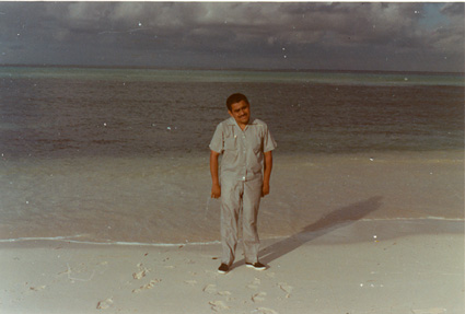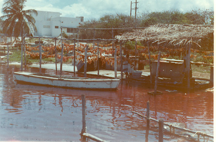 1971Vista de un muelle, hay una lancha y una palapa de paja.