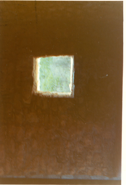 1971Vista de un agujero o ventana chica de una construcción de piedra.
