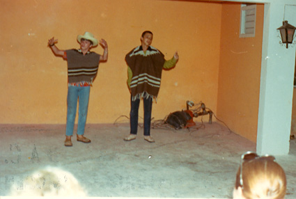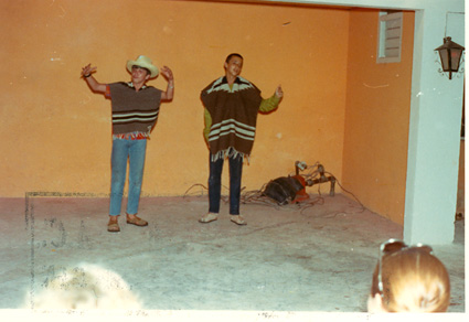 1971Dos chicos vestidos con jorongo y sombrero de paja haciendo una representación teatral.