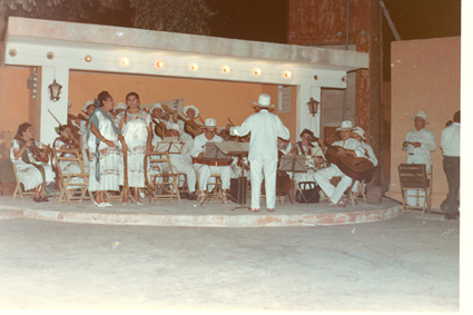 1971Una orquesta de musica local, los músicos van con vestimenta regional.