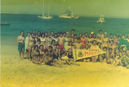 NO IDENTIFICADOFoto de grupo, portan un banderin del Colegio y estan a la orilla del mar. Detrás varias embarcaciones.