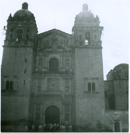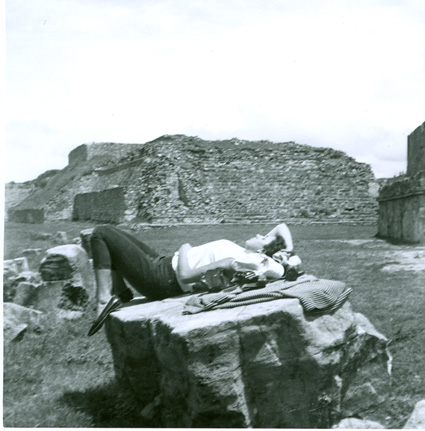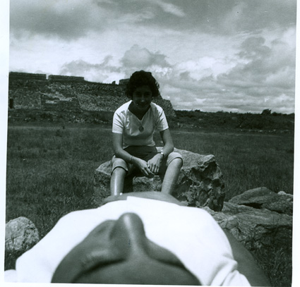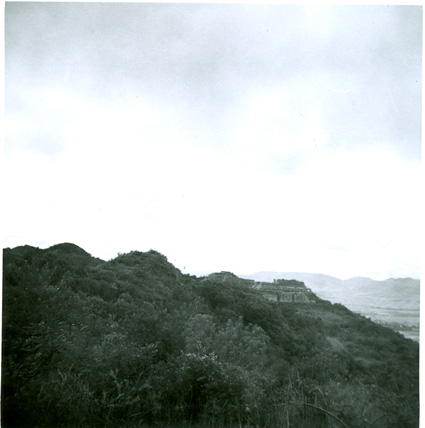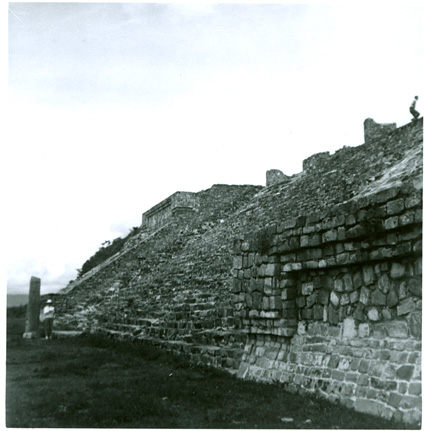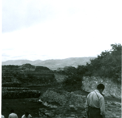1961Vista de lejos de una construcción de piedra prehispánica. Al frente se ve una construcción en ruinas.