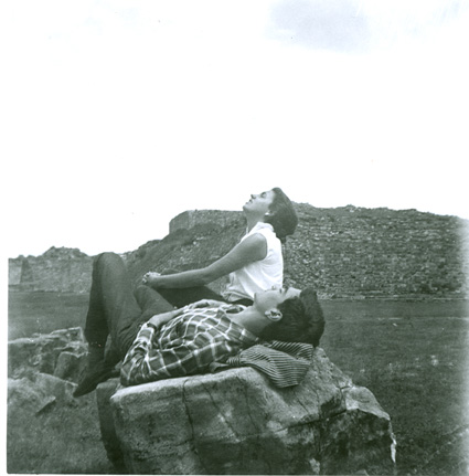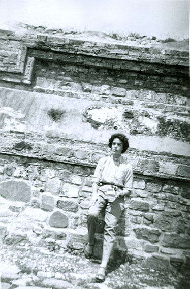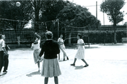 1961Grupo de chicas subiendo por una escalera de piedra.