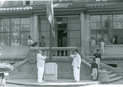 NO IDENTIFICADOHaciendo honores a la bandera afuera de un edificio de ladrillo.