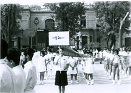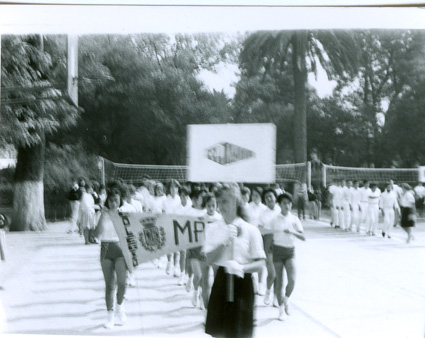 NO IDENTIFICADODesfile de DEPORTES, llevan banderines, detrás se ven las canchas de volleyball.
