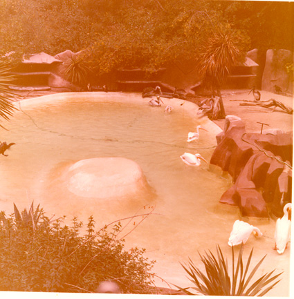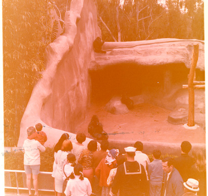 1970Vista de personas observando a un gorila en su jaula en un zoológico.