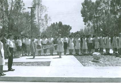 NO IDENTIFICADOGrupo de alumnas uniformadas, formando filas, llevan banderín del Colegio.