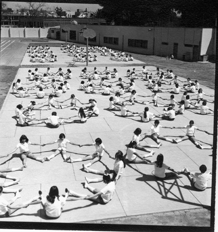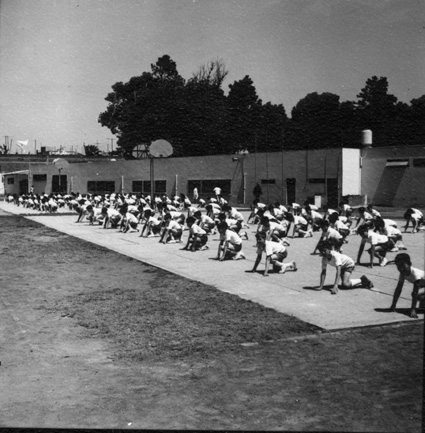 NO IDENTIFICADOClase de DEPORTES, alumnos agachados sobre rodillas.