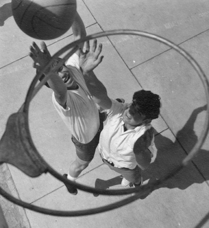 NO IDENTIFICADOVista desde arriba de una canasta de basquetball y dos chicos encestando.