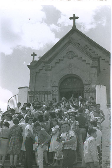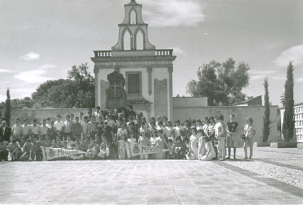 NO IDENTIFICADOFoto de grupo delante de una iglesia, llevan banderín del Colegio.