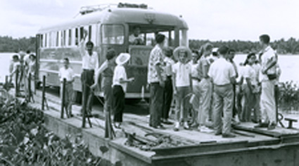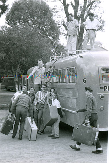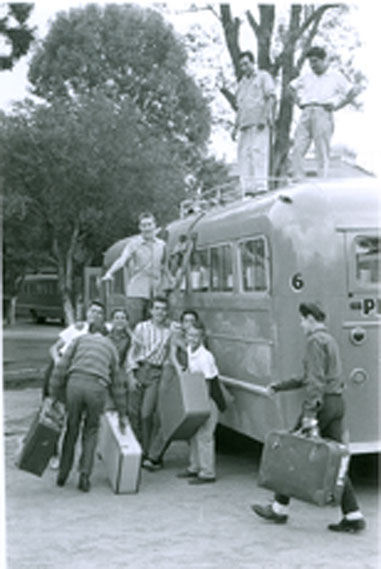 1962Grupo de alumnos parados detrás de un autobus escolar.