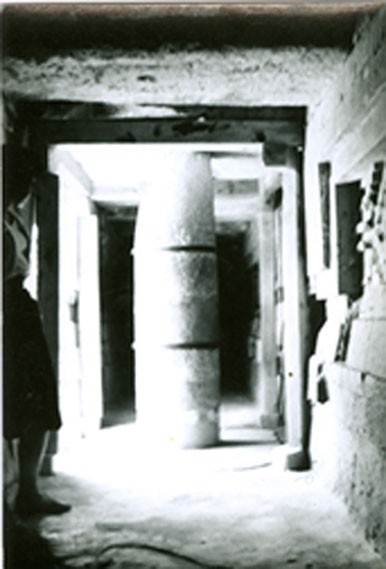 NO IDENTIFICADOVista del interior de una construcción prehispánica, en la pared hay simbolos y al centro una columna.