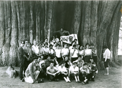 NO IDENTIFICADOGrupo de alumnos reunidos para la foto de grupo al fie del tronco de un árbol, posiblemente sea el del Tule, llevan un banderín del Colegio.