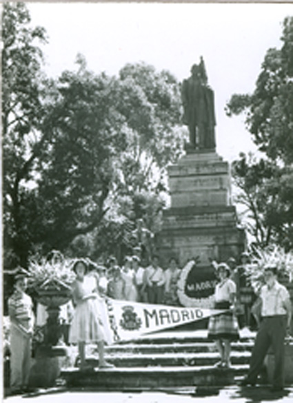 NO IDENTIFICADOGrupo de alumnos haciendo honores a un monumento, hay un adorno floral y un banderín del Colegio.