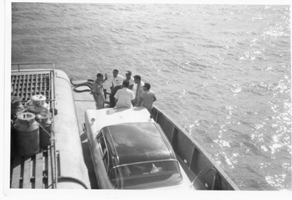 NO IDENTIFICADOGrupo de personas junto a un coche que es transportado en un ferry.