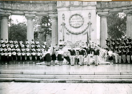 1961Homenaje a Benito Juárez, Ceremonia Cívica. Alumnos saludando a la bandera en el Hemiciclo a Benito Juárez, de pie en las escaleras. Están las escoltas varonil y femenil con las banderas.