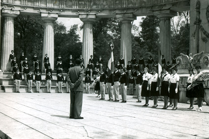 1961Homenaje a Benito Juárez, Ceremonia Cívica. Alumnas de pie en las escaleras, saludando a la bandera en el Hemiciclo a Benito Juárez. Se ve la escolta femenil que sostiene la bandera.