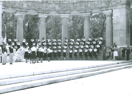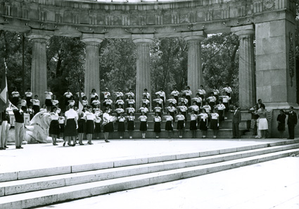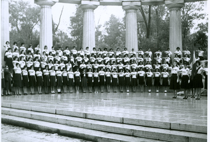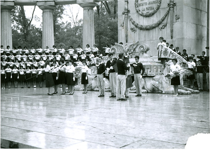 1961Homenaje a Benito Juárez, Ceremonia Cívica. Alumnas de pie en las escaleras, en posición de firmes, en el Hemiciclo a Benito Juárez.