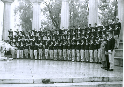 1961Homenaje a Benito Juárez, Ceremonia Cívica. Alumnos de pie en las escaleras, en posición de firmes, en el Hemiciclo a Benito Juárez, al centro habla en profesor Betancourt.