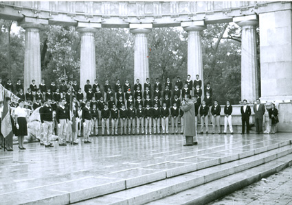 1961Homenaje a Benito Juárez, Ceremonia Cívica. Alumnos de pie en las escaleras, en posición de firmes en el Hemiciclo a Benito Juárez. Se ven las escoltas varonil y femenil que llevan las banderas. Al centro habla un profesor.