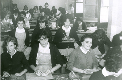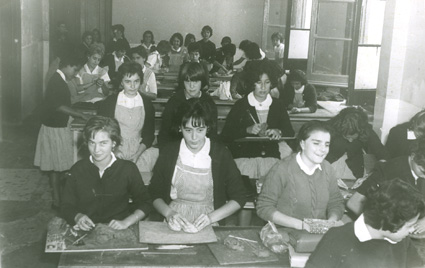 196?Grupo mixto de jóvenes mujeres realizando un modelo en plastilina. Están sentadas en mesas rectangulares una tras otra.