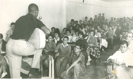 196?Grupo mixto de jóvenes sentados en sus pupitres, en dos filas, escuchando a un profesor o invitado tocar la guitarra al frente del salón. Este último se encuentra de espaldas a la cámara.