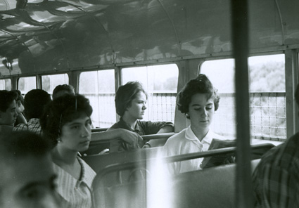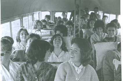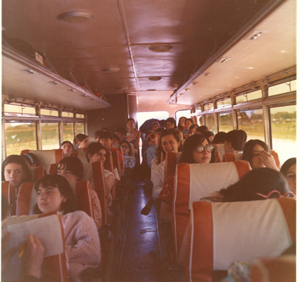 196?Alumnas sentadas en el camión escolar. La jóven en primera fila esta leyendo un libro.